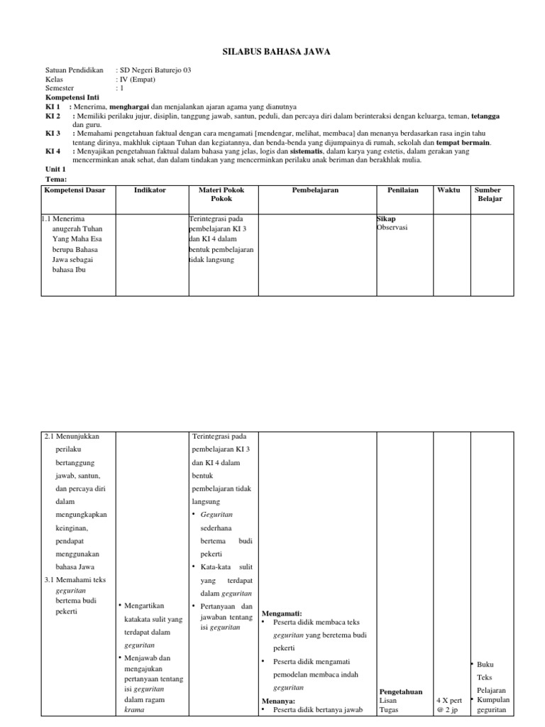 Silabus Bahasa Jawa Kelas 4 Semester 2 - RPP Silabus Bahasa Jawa SD MI Kelas 1 2 3 4 5 6 Lengkap ... : Silabus bahasa jawa kelas 4 semester 2.